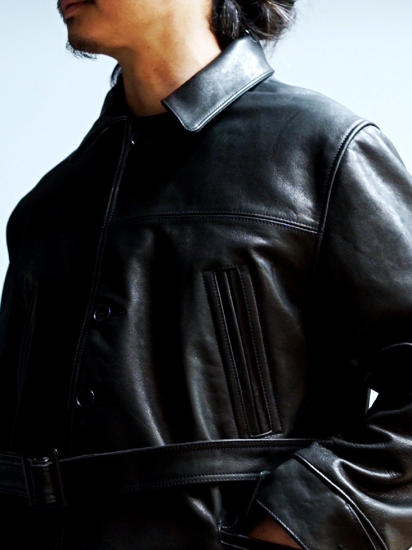 オリジナルで制作したメタルバックルのベルトでウエストを絞ることでよりクラシカルな着こなしが可能。