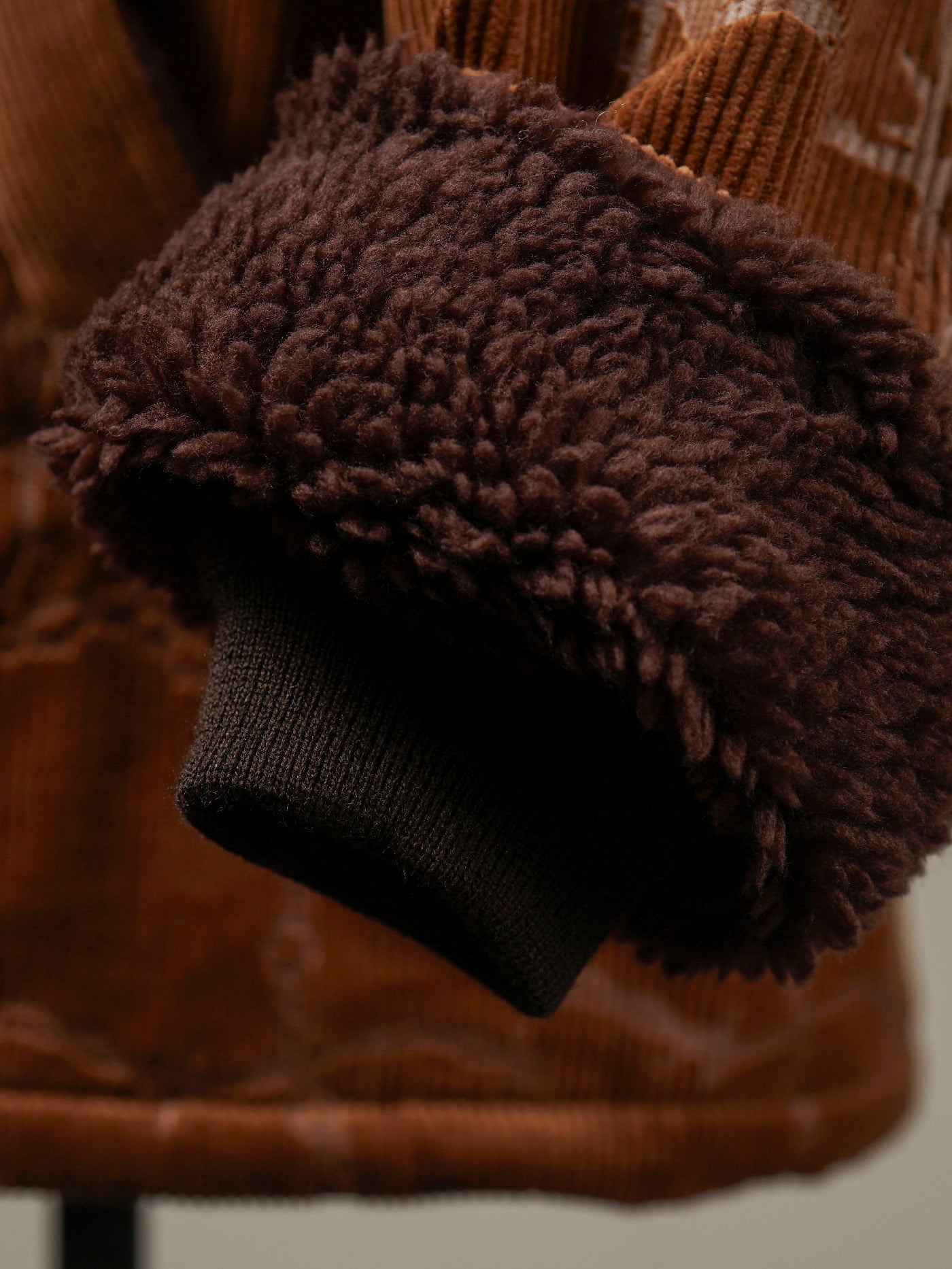 身頃裏、衿、ポケット口にやわらかなアクリルボア、袖裏に中綿キルト、レザーくるみボタン、大きめの腰ポケット、風の侵入を防ぐ袖口のインナーリブなど上質さと機能性の高いディテールが同居した男らしくアダルトな仕上がりが特徴。
