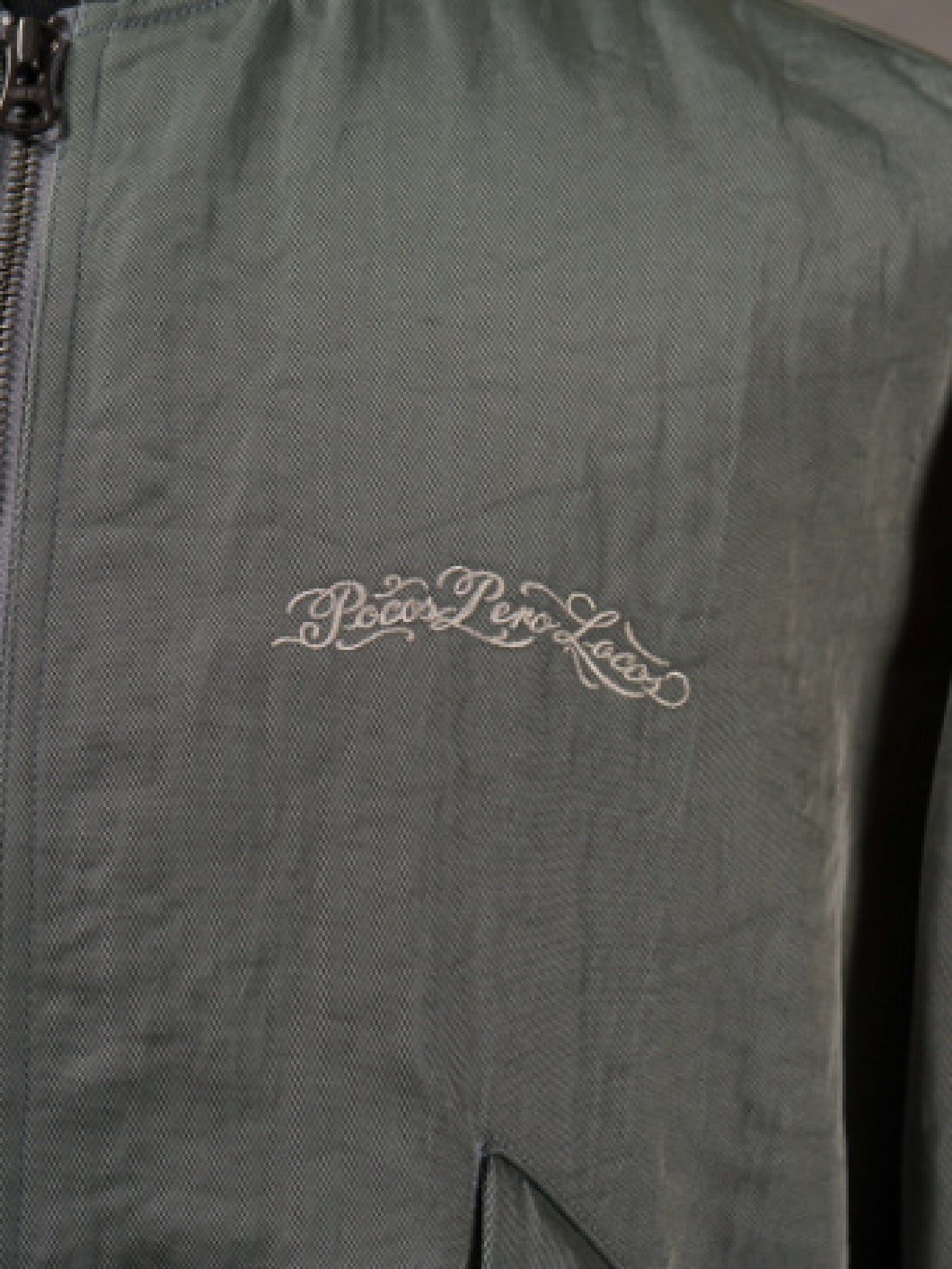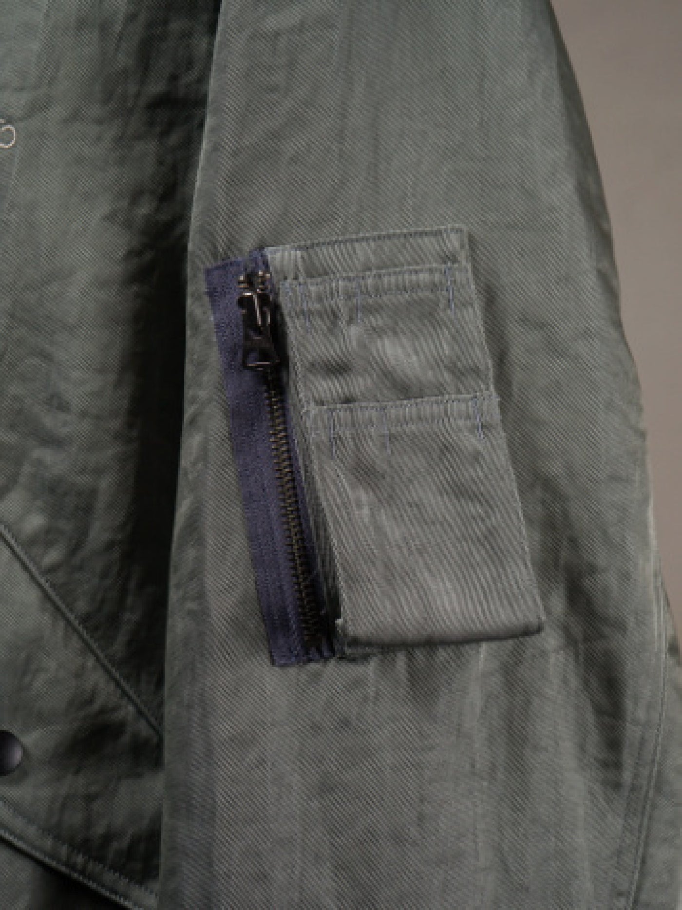 「L-2」らしいフラップ付きのポケットと裾の三角フラップ、左袖に配したユーティリティポケットをベースに、左胸の刺繍、背面のプリントや袖ポケットのファスナーの台布カラーがアクセントになっています。