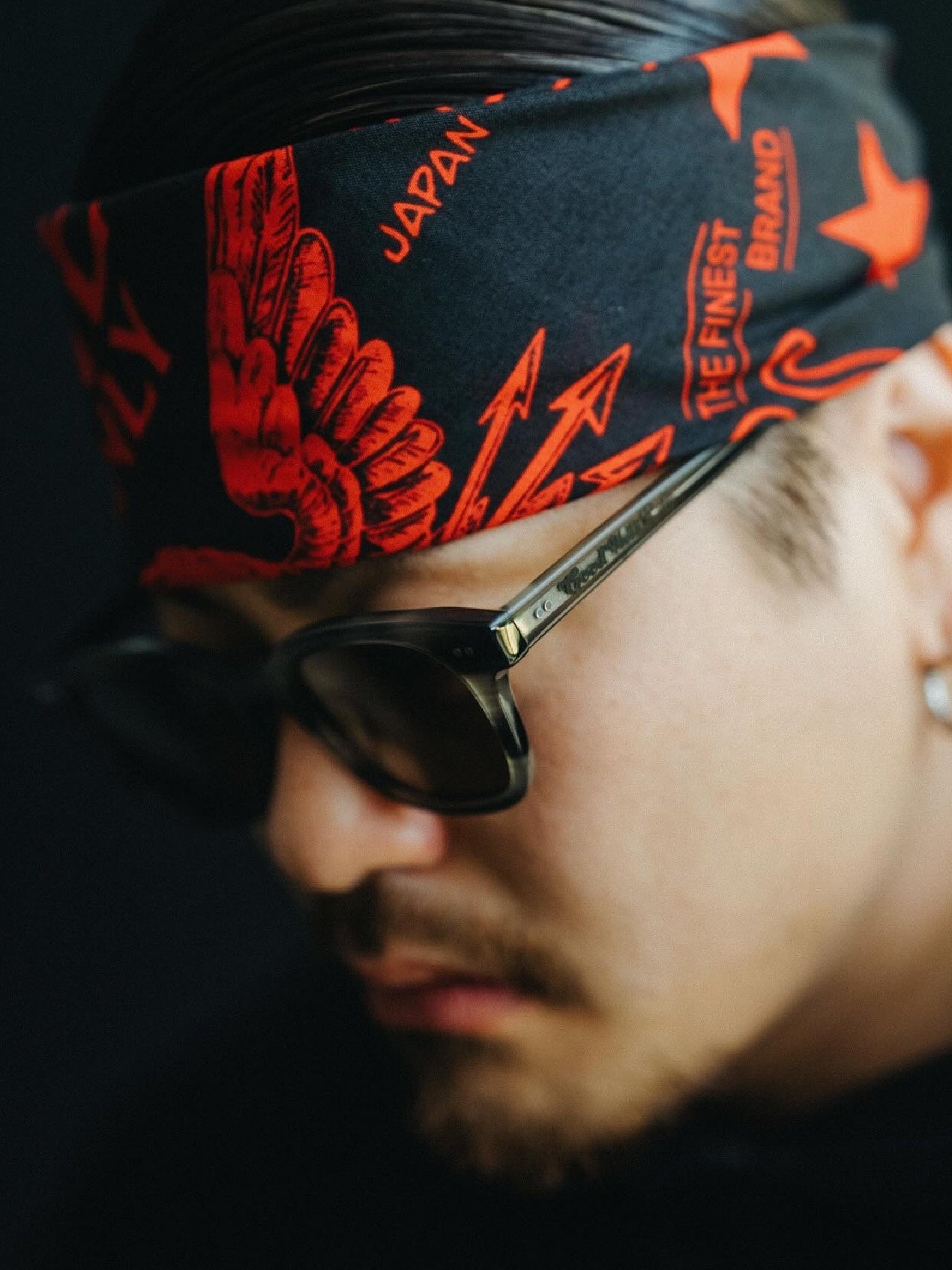 テンプルサイドにブランドロゴ、内側にカンパニーロゴを同系色でさり気なくプリントしています。