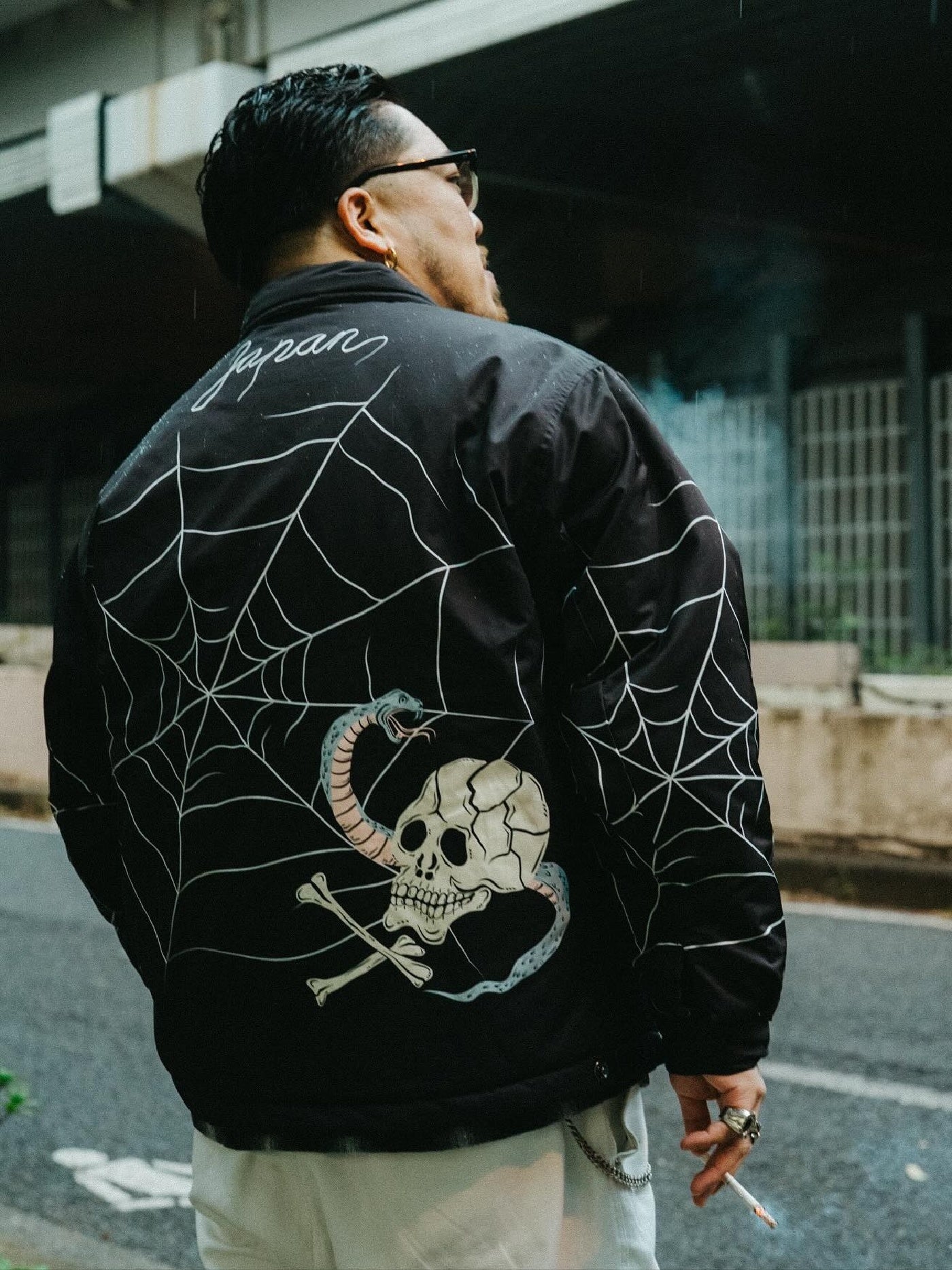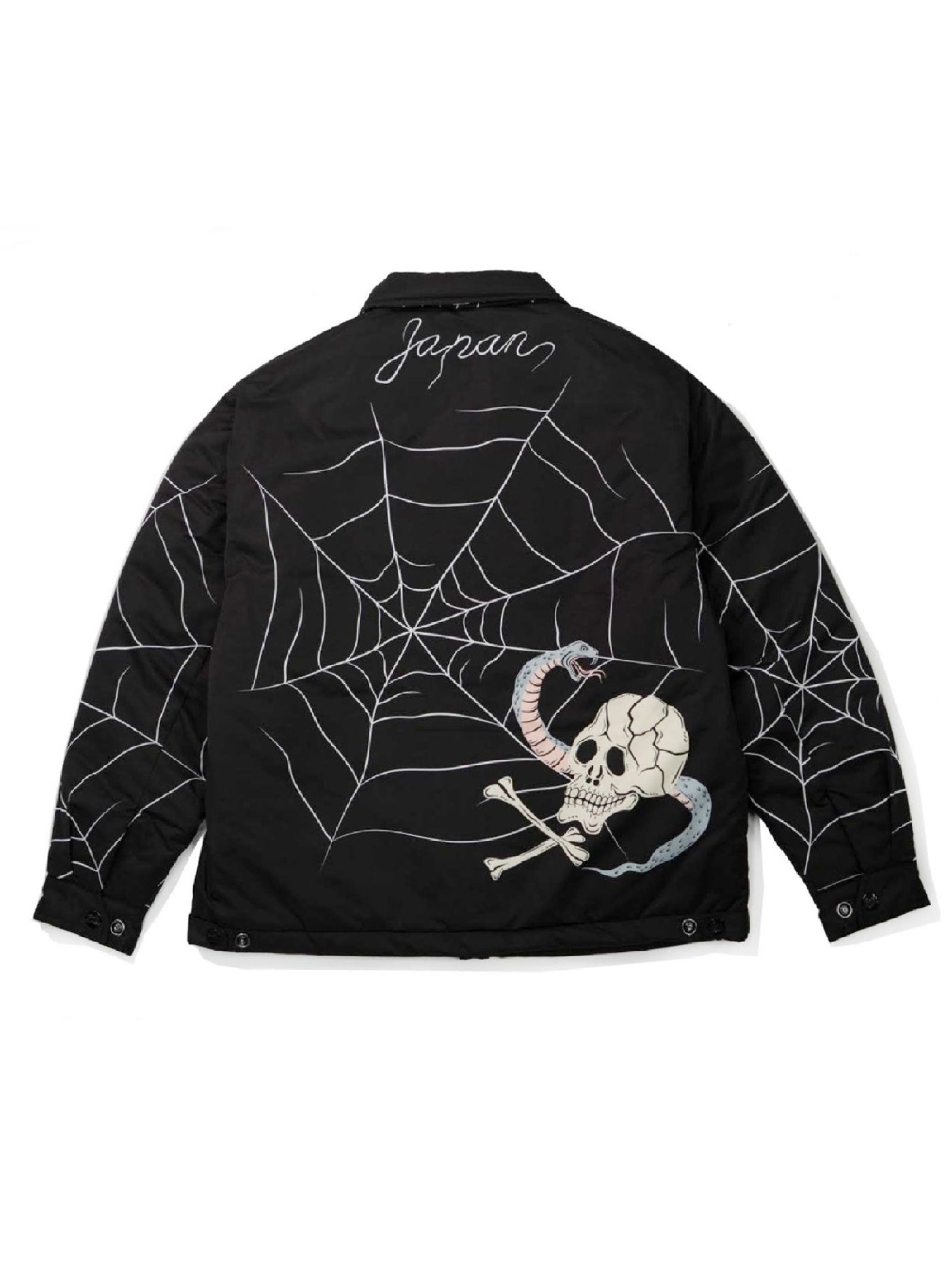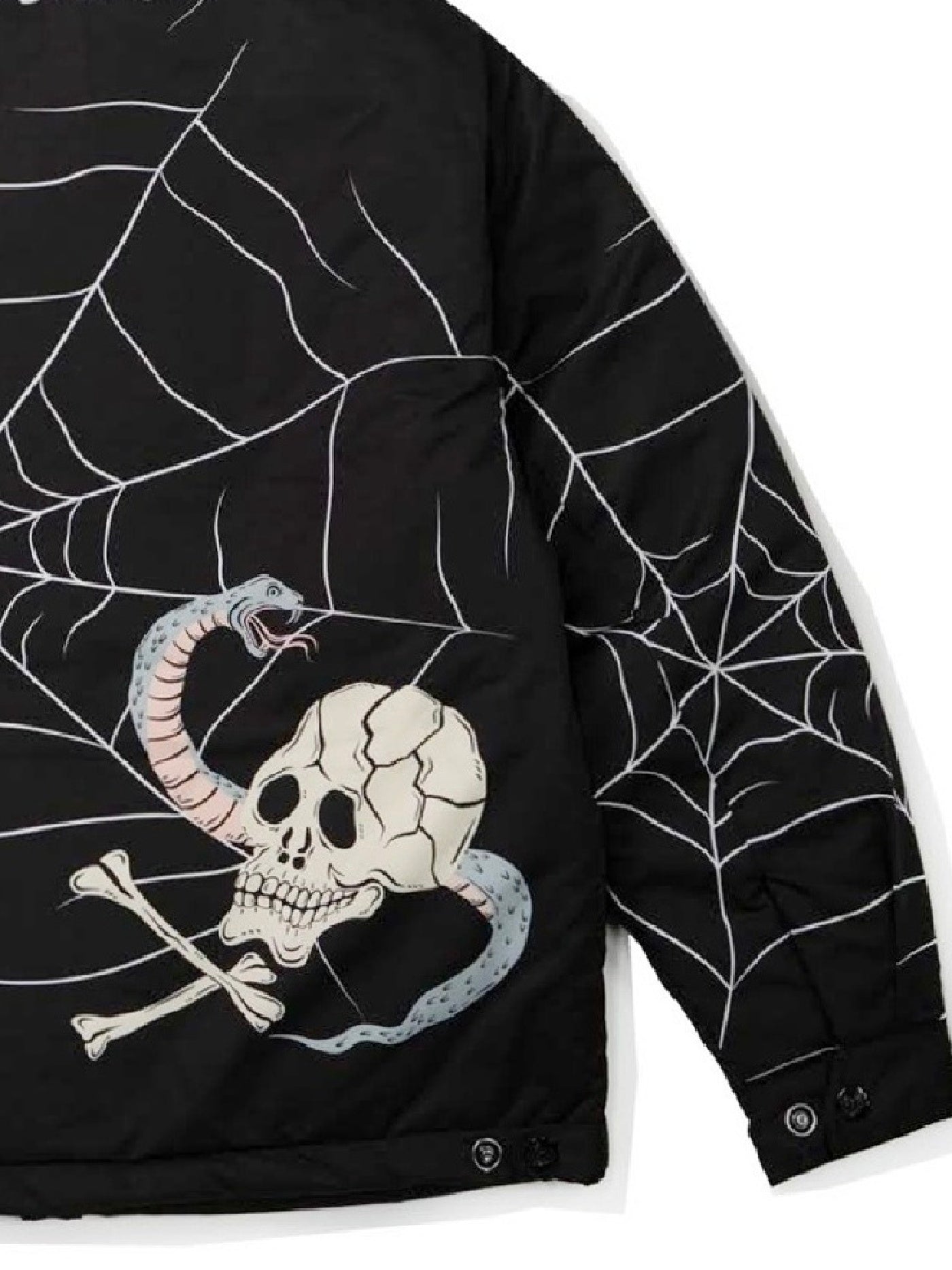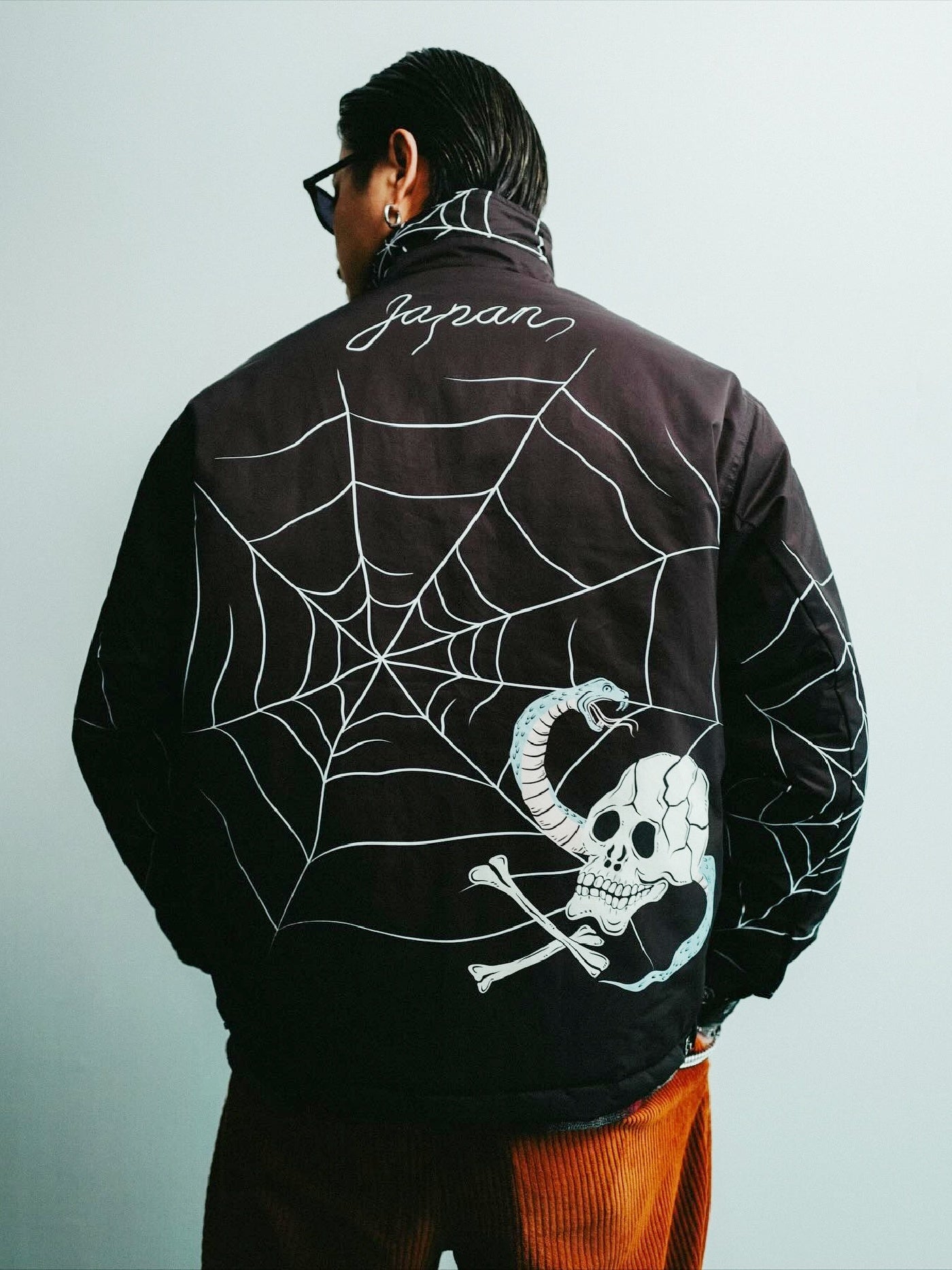 detail : ハンドペイント風のスパイダーウェブと、ビンテージスカジャンに見られる蛇と髑髏を落とし込んだ中綿キルトのコーチジャケット、SPIDER WEB PATTERN PADDED COACH JACKET。