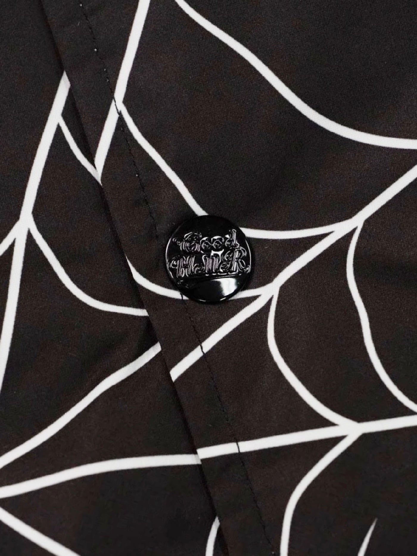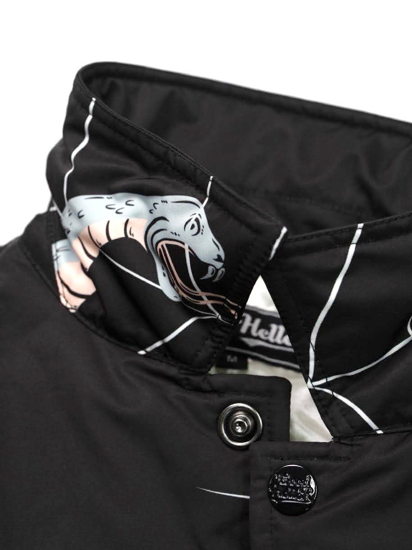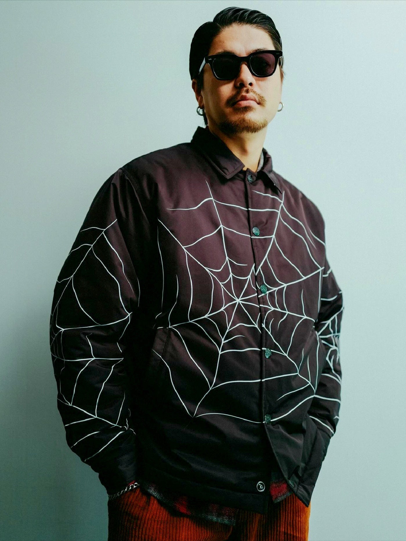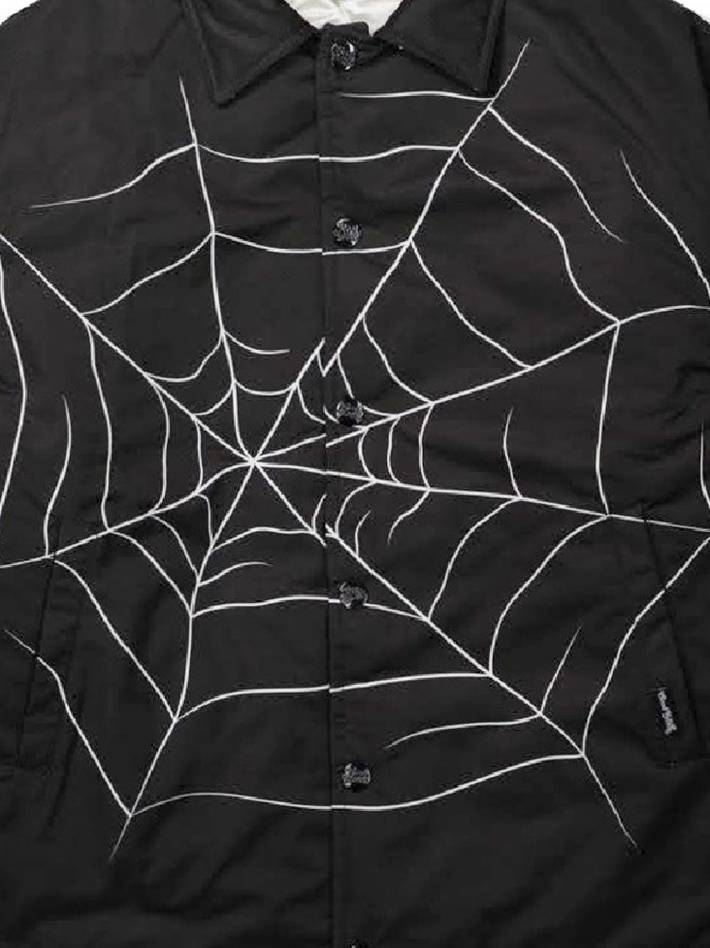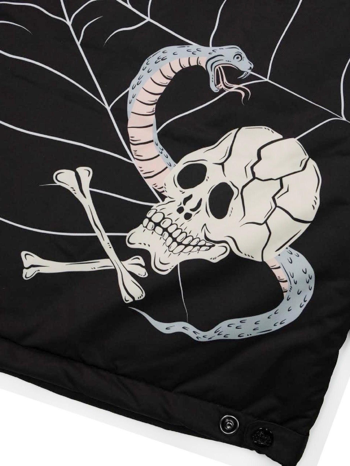 detail : ハンドペイント風のスパイダーウェブと、ビンテージスカジャンに見られる蛇と髑髏を落とし込んだ中綿キルトのコーチジャケット、SPIDER WEB PATTERN PADDED COACH JACKET。
