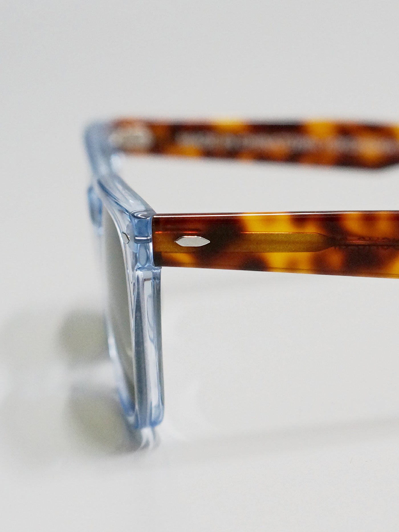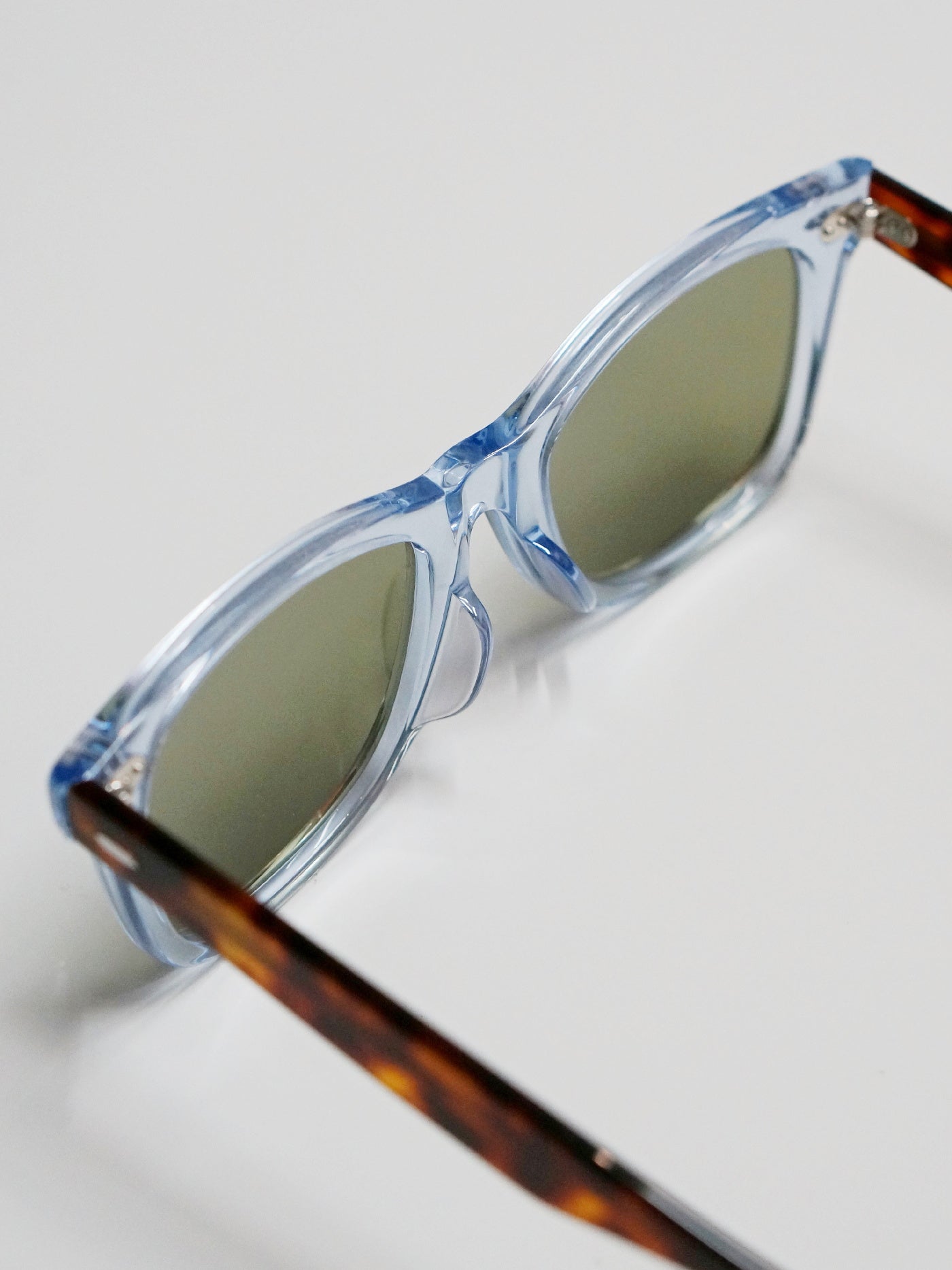 うっすらと青みがかった透明度の高いクリアのフロントに、琥珀のような虎縞が美しいアンバーカラーのテンプル、レンズは定番のダークグリーンをセットした上品でリゾート感のあるニューモデル。