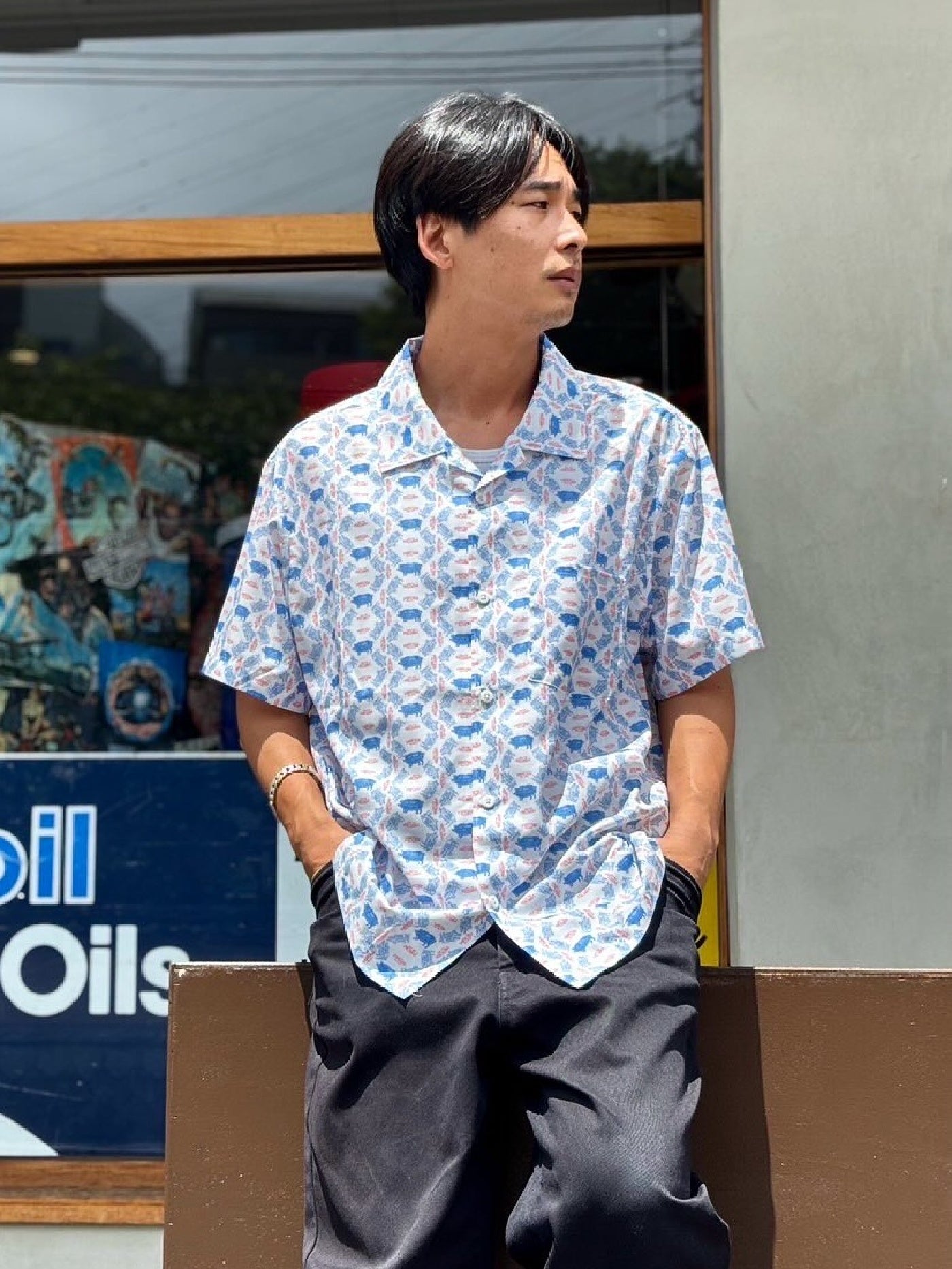 detail : 軽く柔らかくかつ耐久性・耐摩耗性に優れる平織りポリエステル生地にオリジナルポークパターンをオールオーバープリントで散りばめた PCGS WORK SHIRT。
