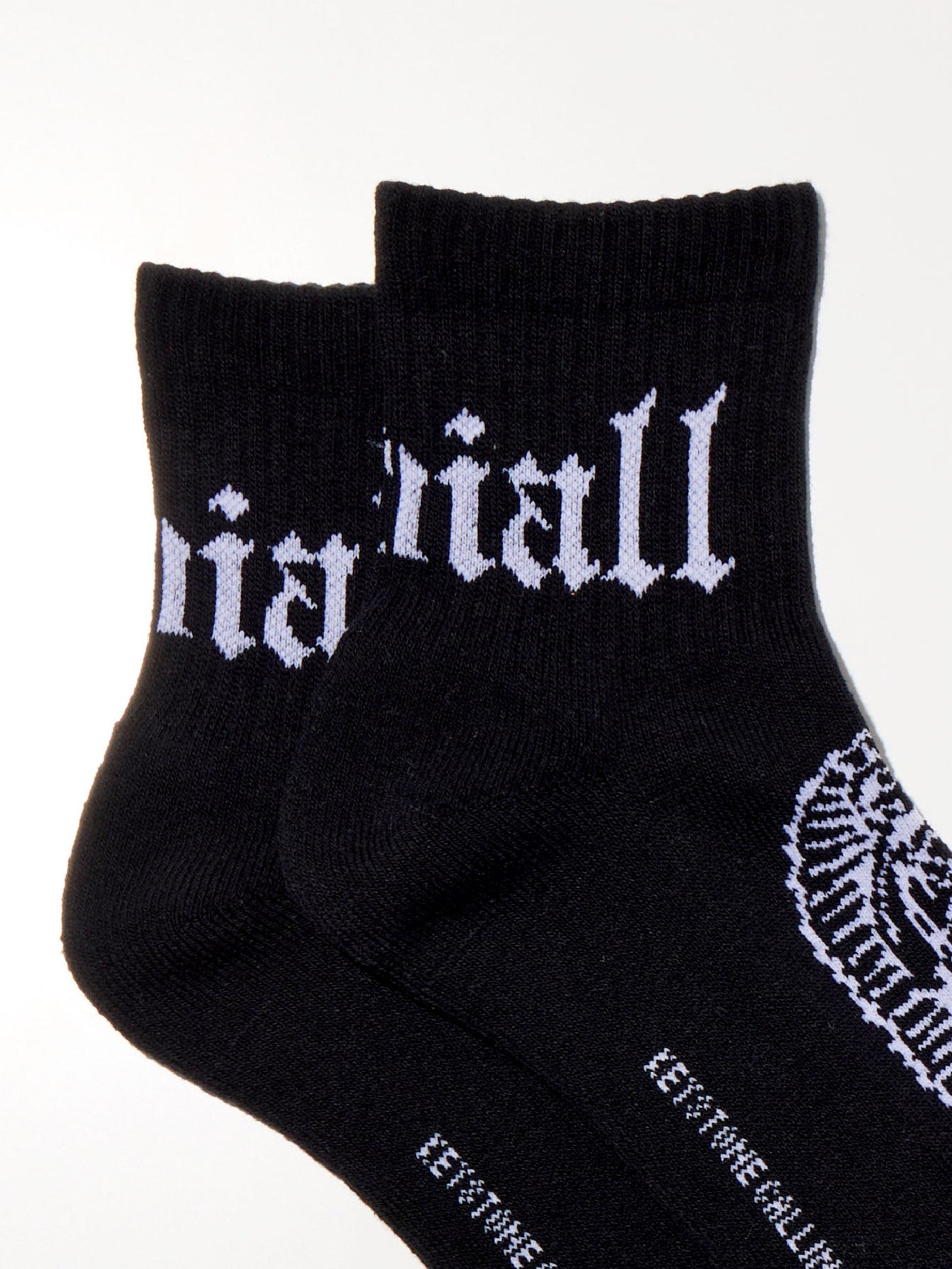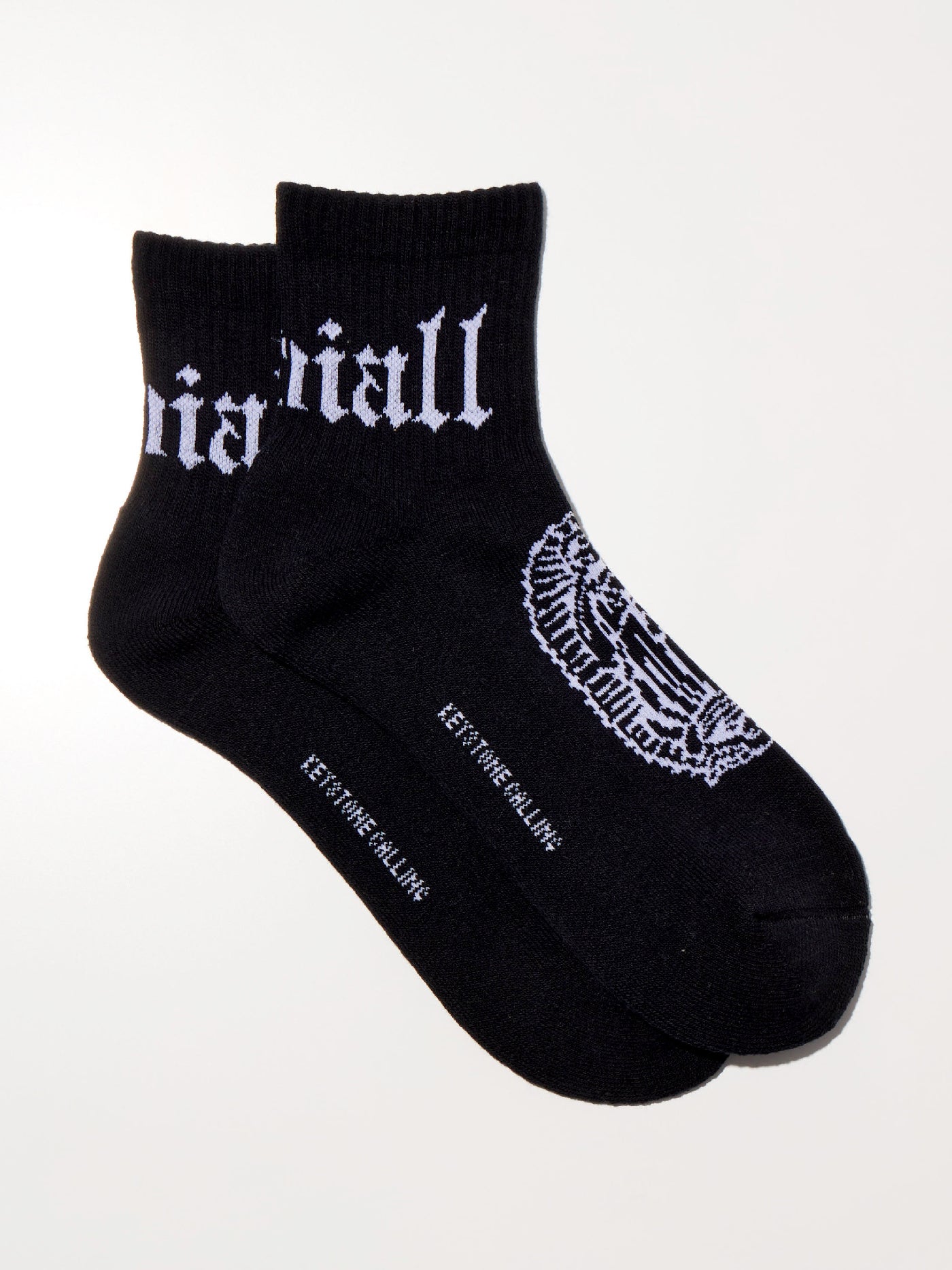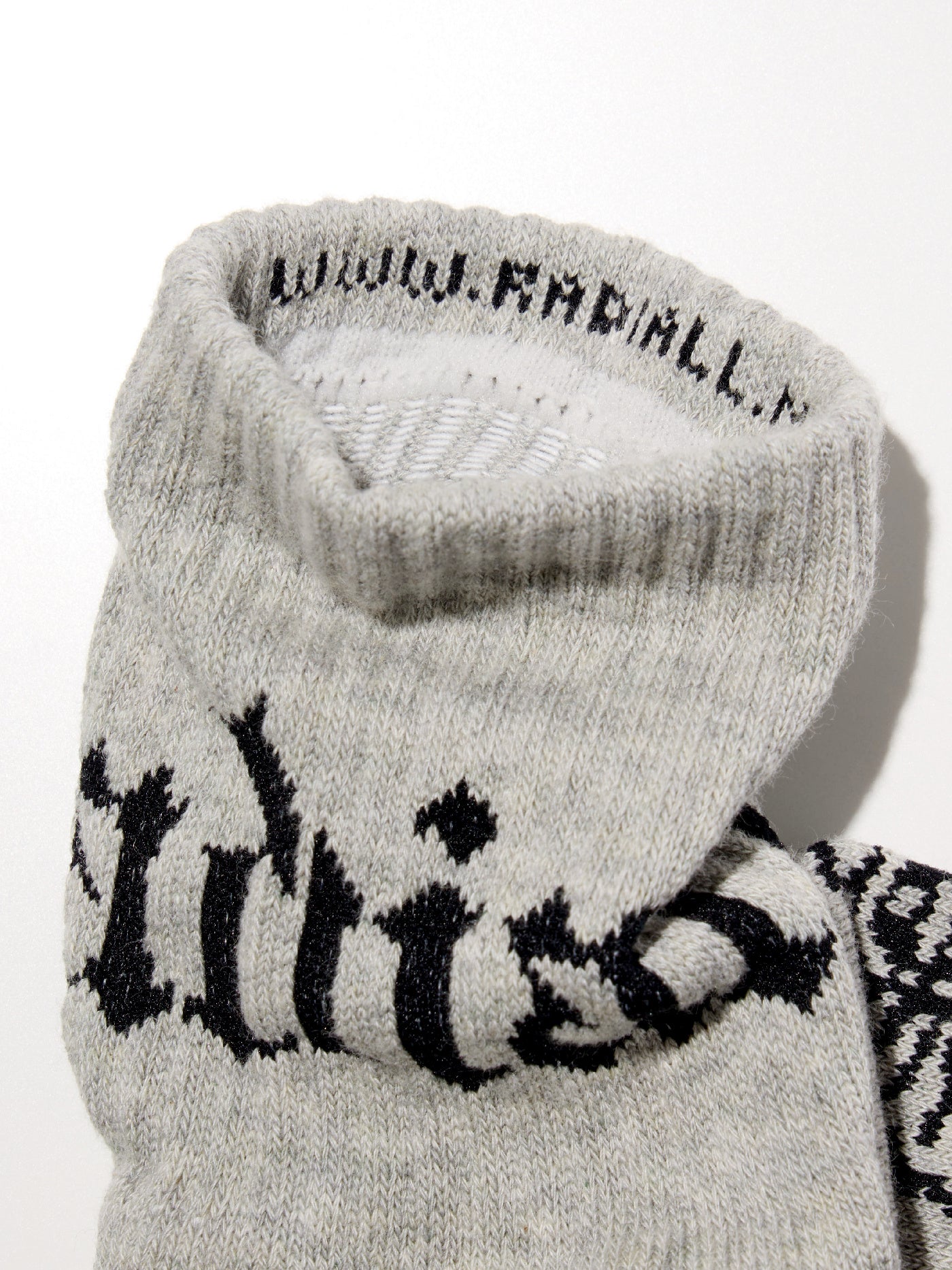 ジャガードでシャフト部分にブラックレターフォントの「RADIALL」、甲に「レコードマリア」、履き口裏に「WWW.RADIALL.NET」、足裏には「NO STASH INSIDE」のレター。