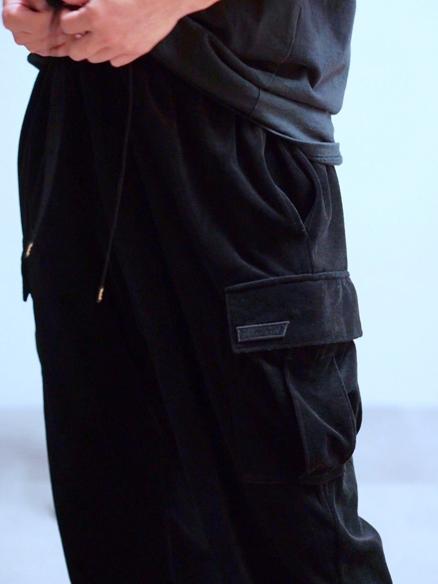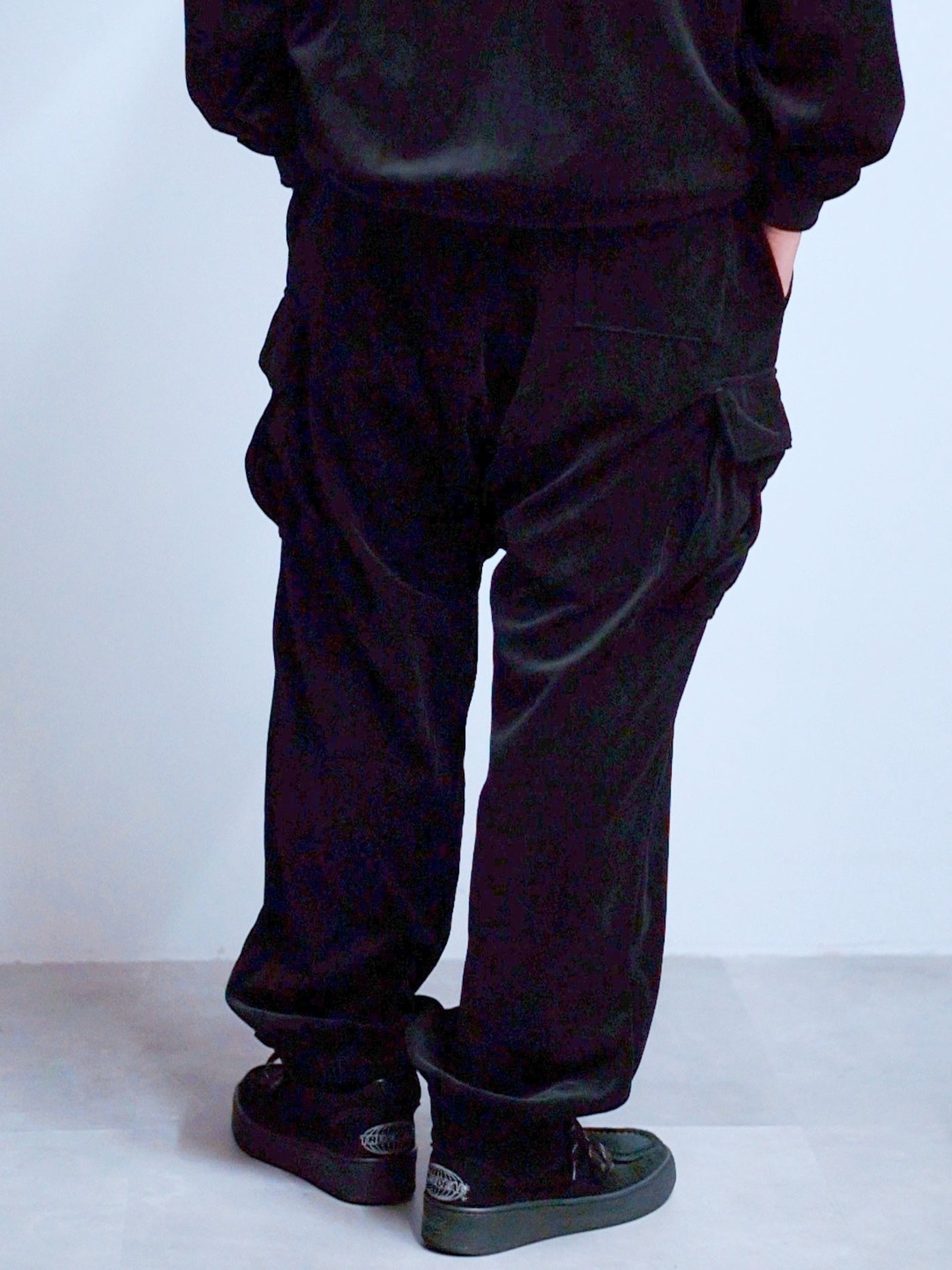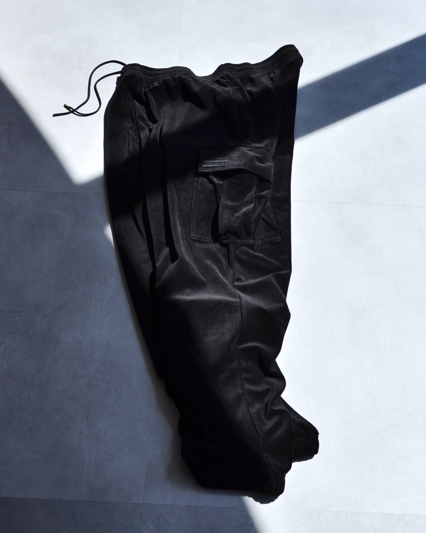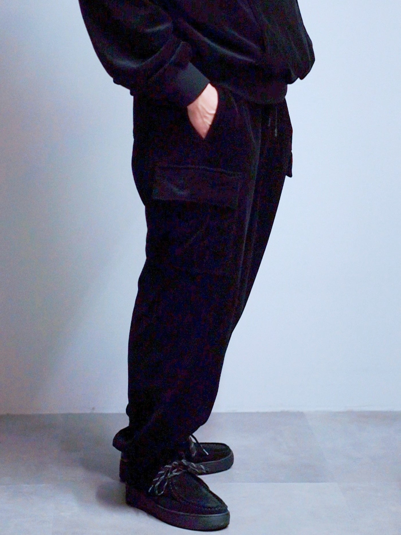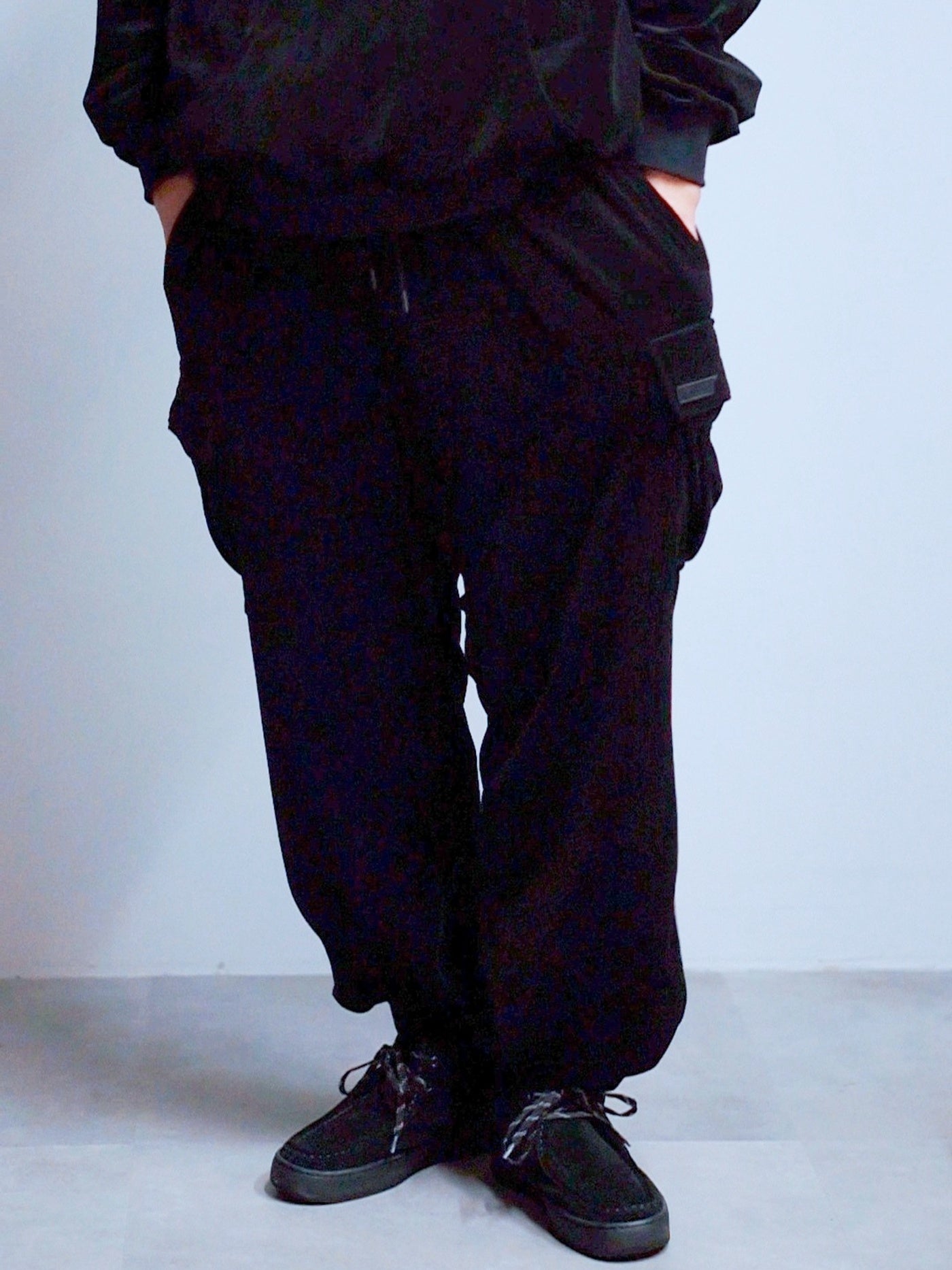 detail : 高級感とストリートな雰囲気を兼ね備えるT/Cベロアを採用したイージー仕様のカーゴパンツ、FLAGS - CARGO TRACK PANTS。