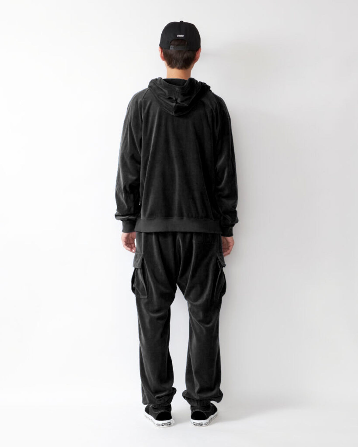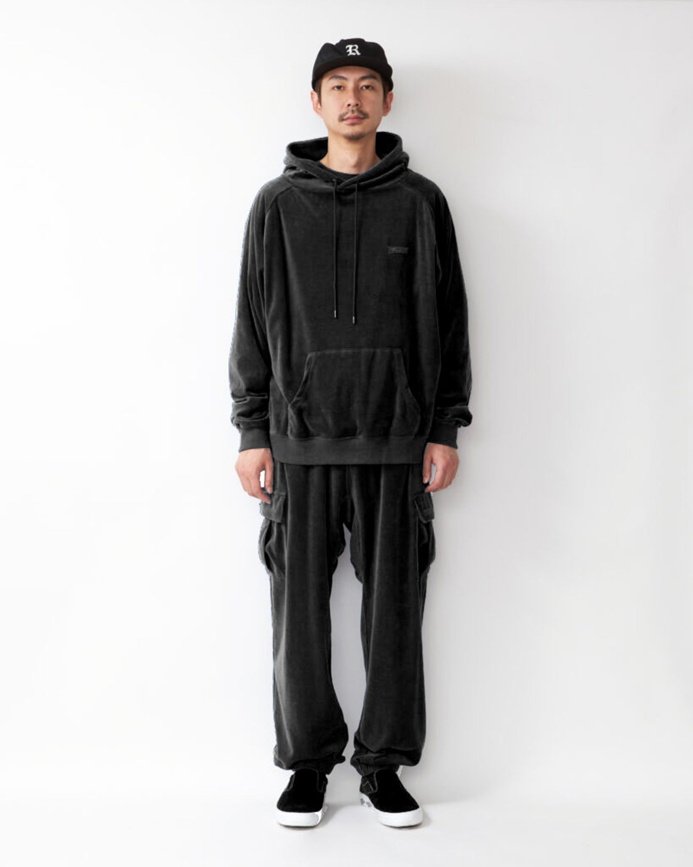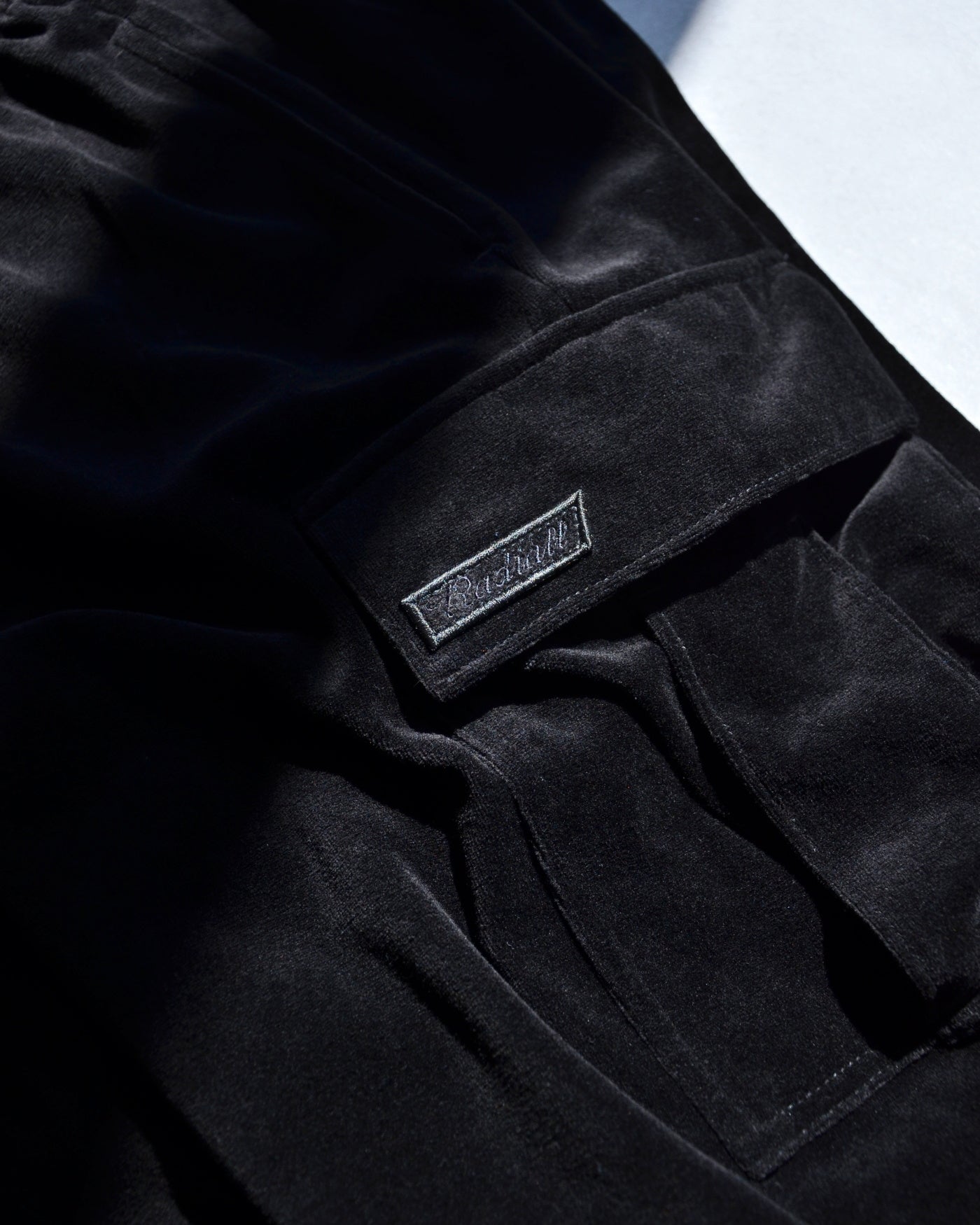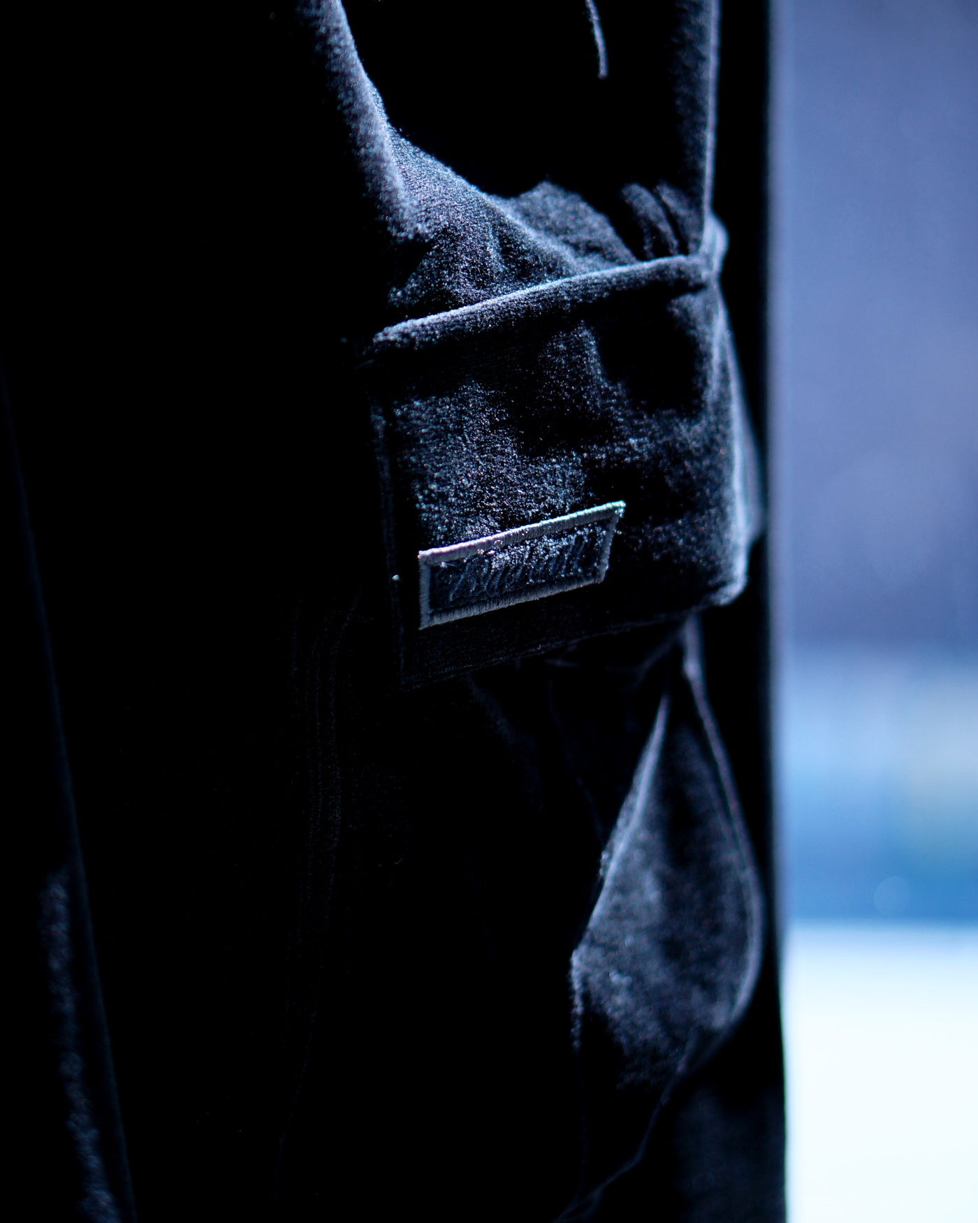 detail : 高級感とストリートな雰囲気を兼ね備えるT/Cベロアを採用したイージー仕様のカーゴパンツ、FLAGS - CARGO TRACK PANTS。
