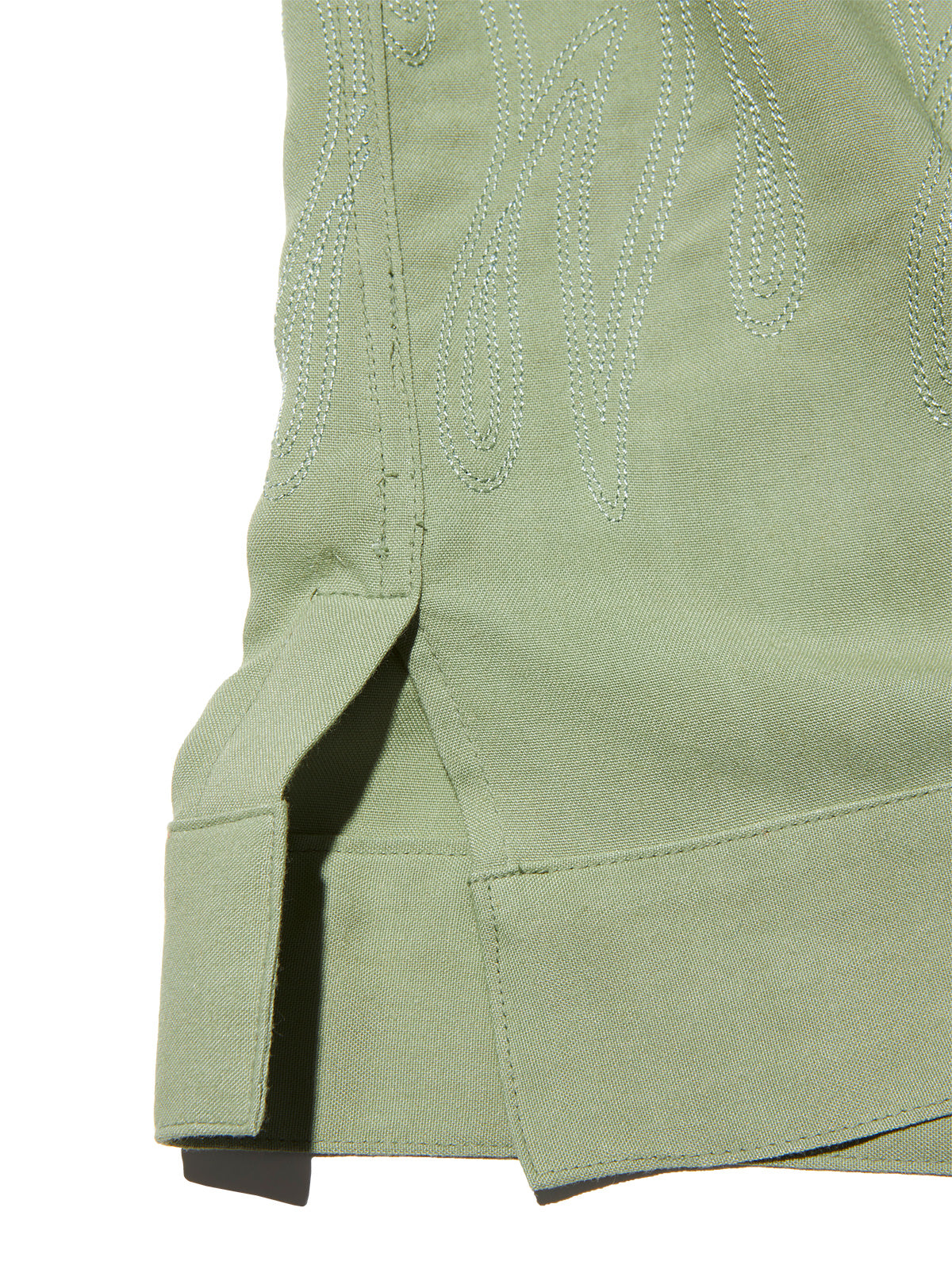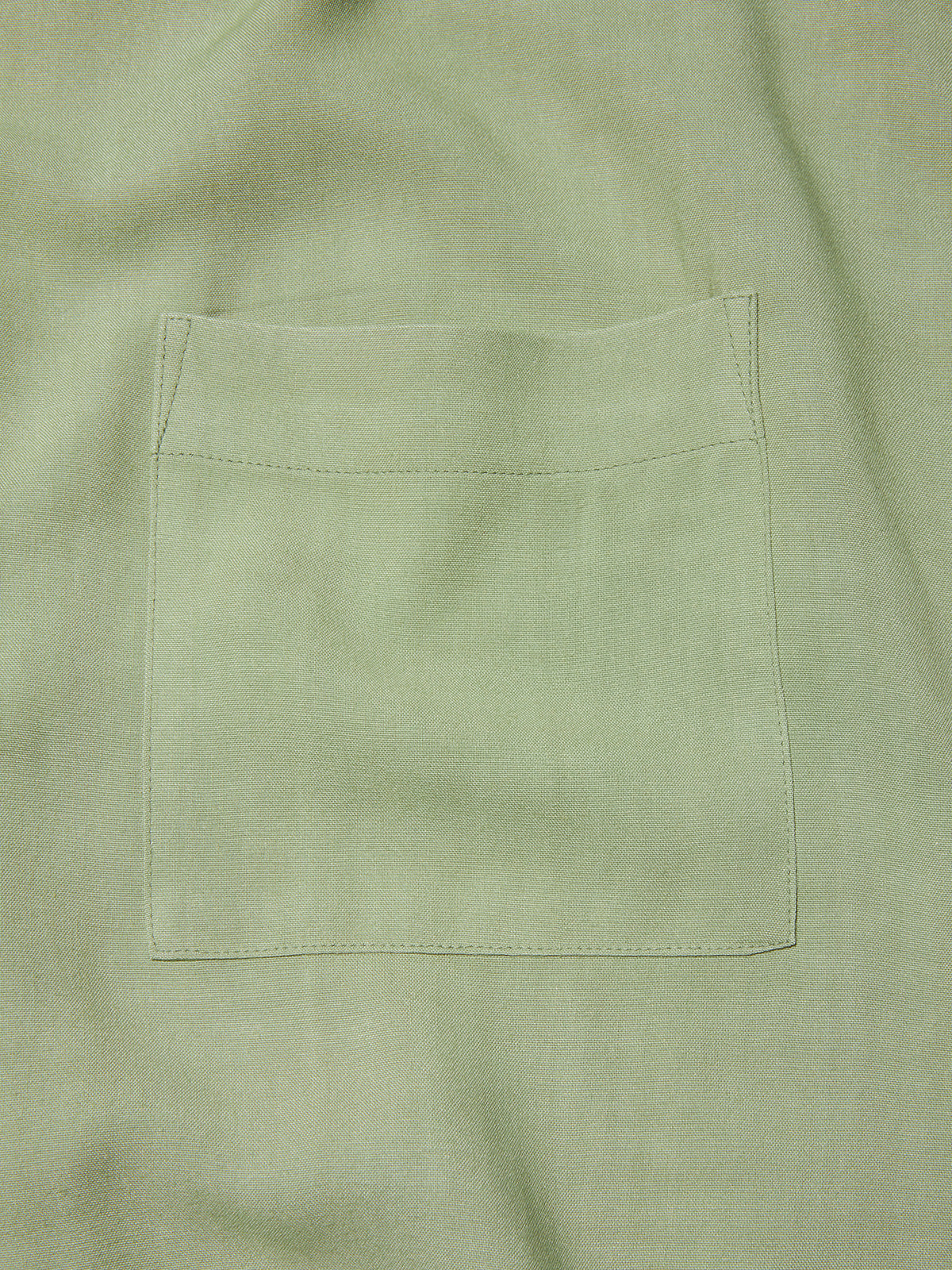Detail : 20スフレーヨンを平織りで織り上げたレーヨン生地を使用したオープンカラーシャツ。