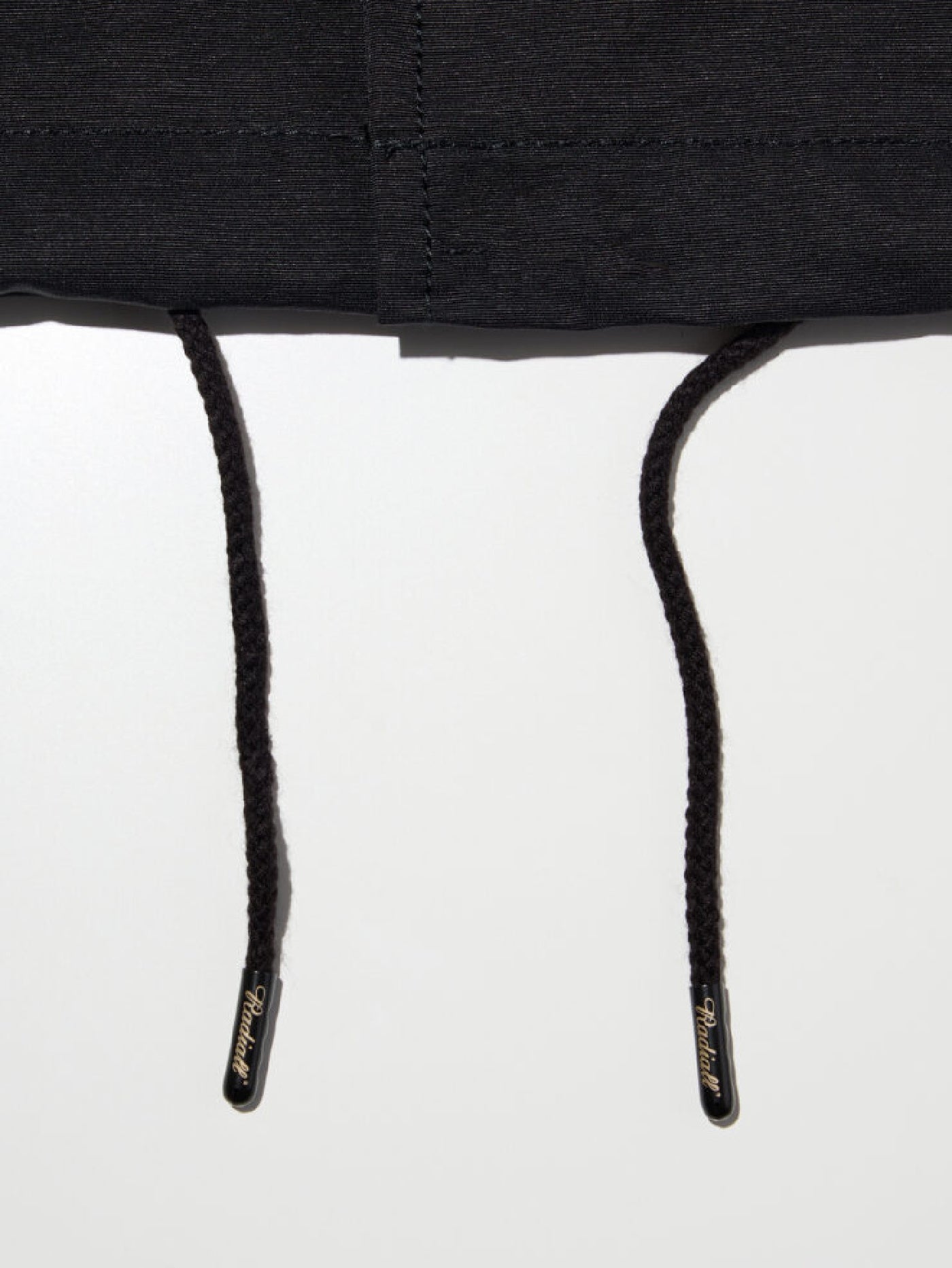 裾口のドローコード先端にはブランドロゴ入りの金属製チップ。