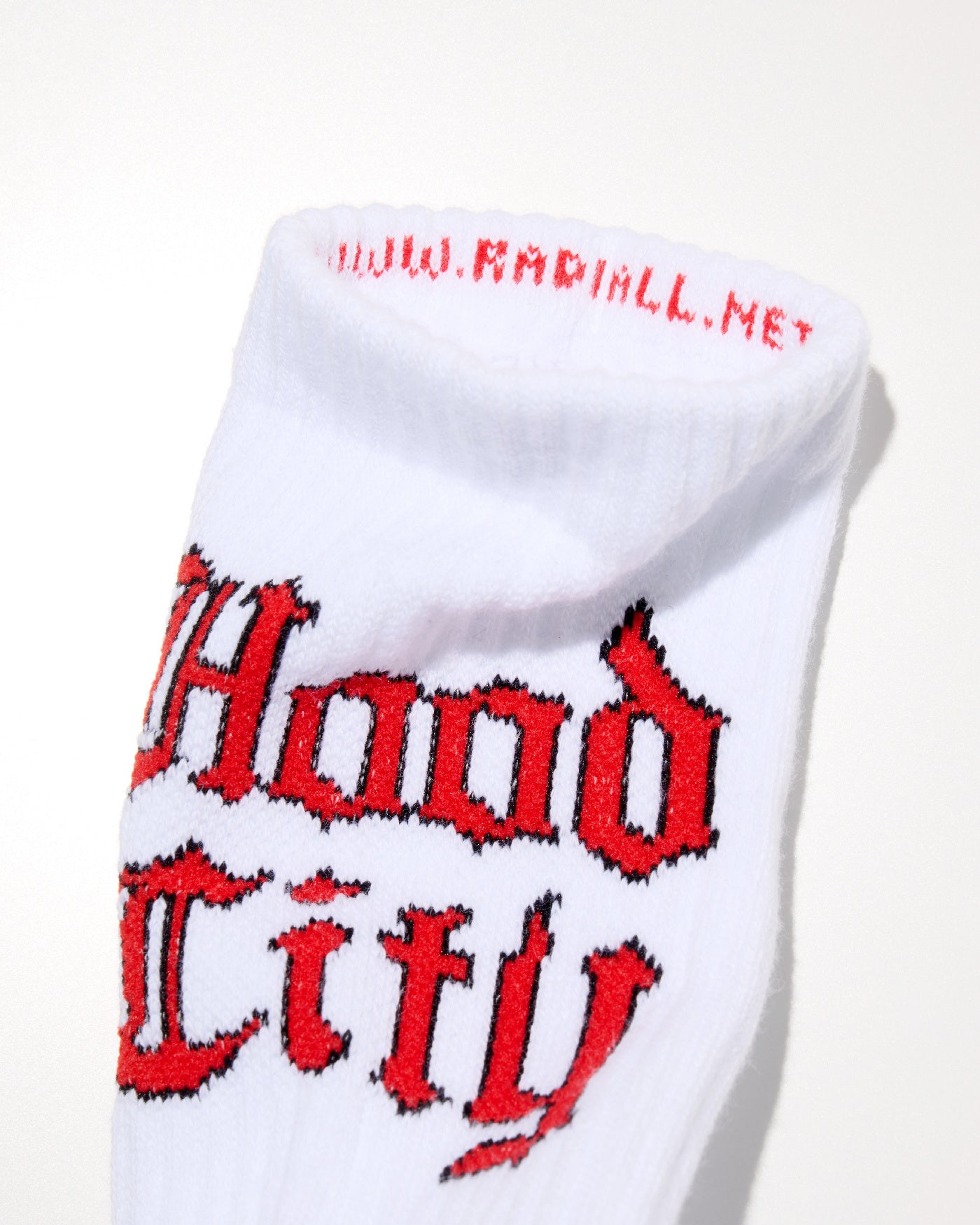 シャフト部分にジャカードで「HOOD CITY」、履き口裏に「WWW.RADIALL.NET」、足裏に「NO STASH INSIDE」のデザイン。