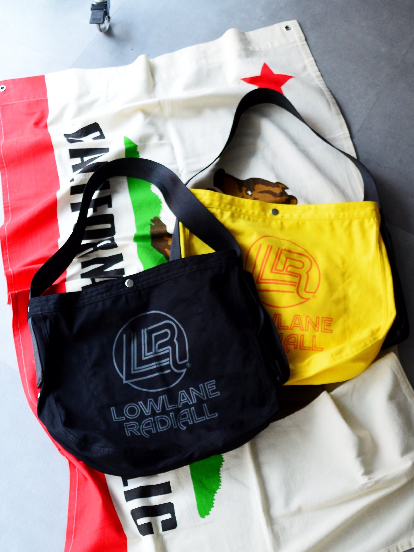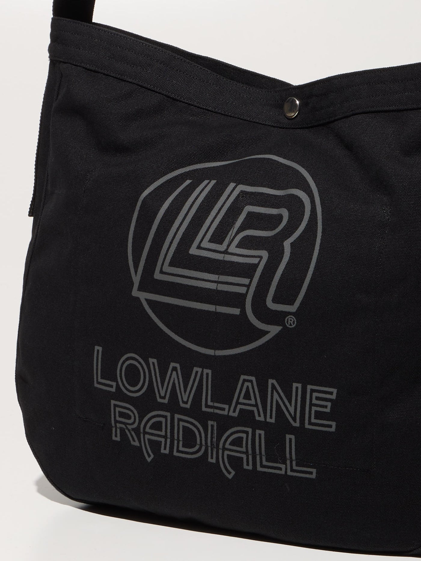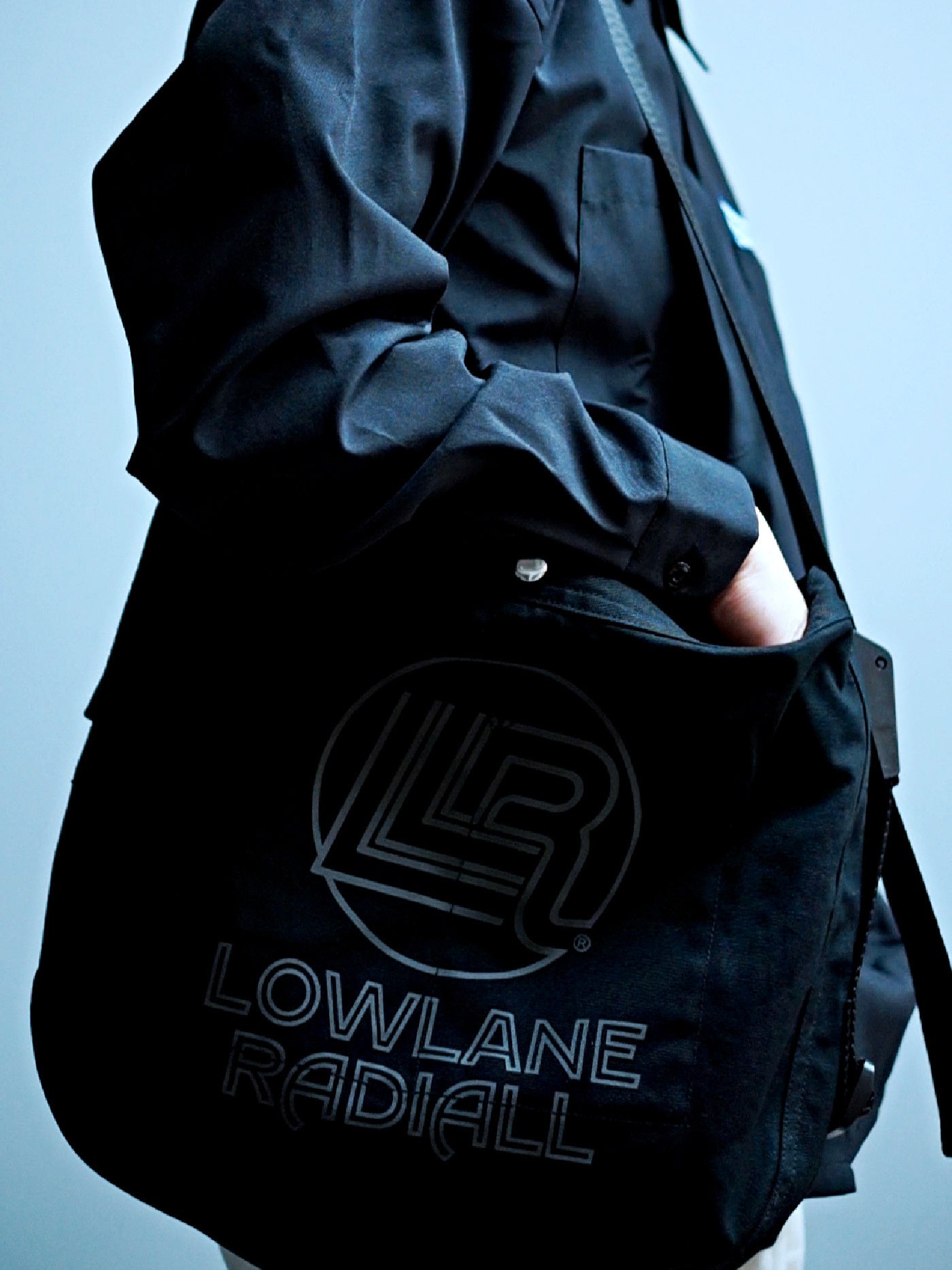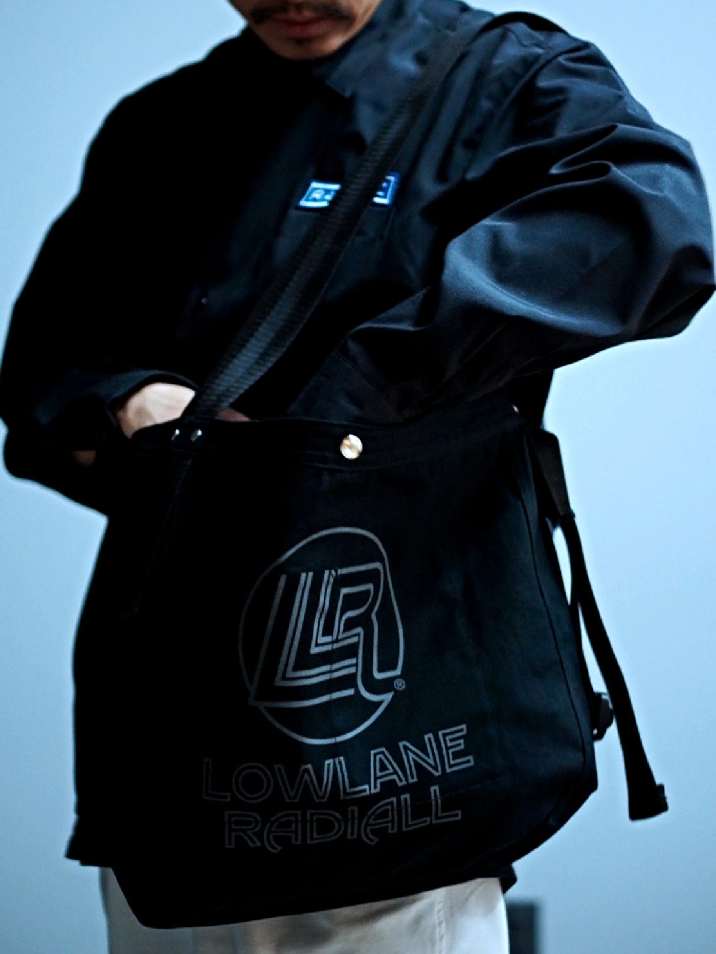 フロントに「LOWLANE RADIALL」のグラフィック、内側には大小のポケットを備えています。