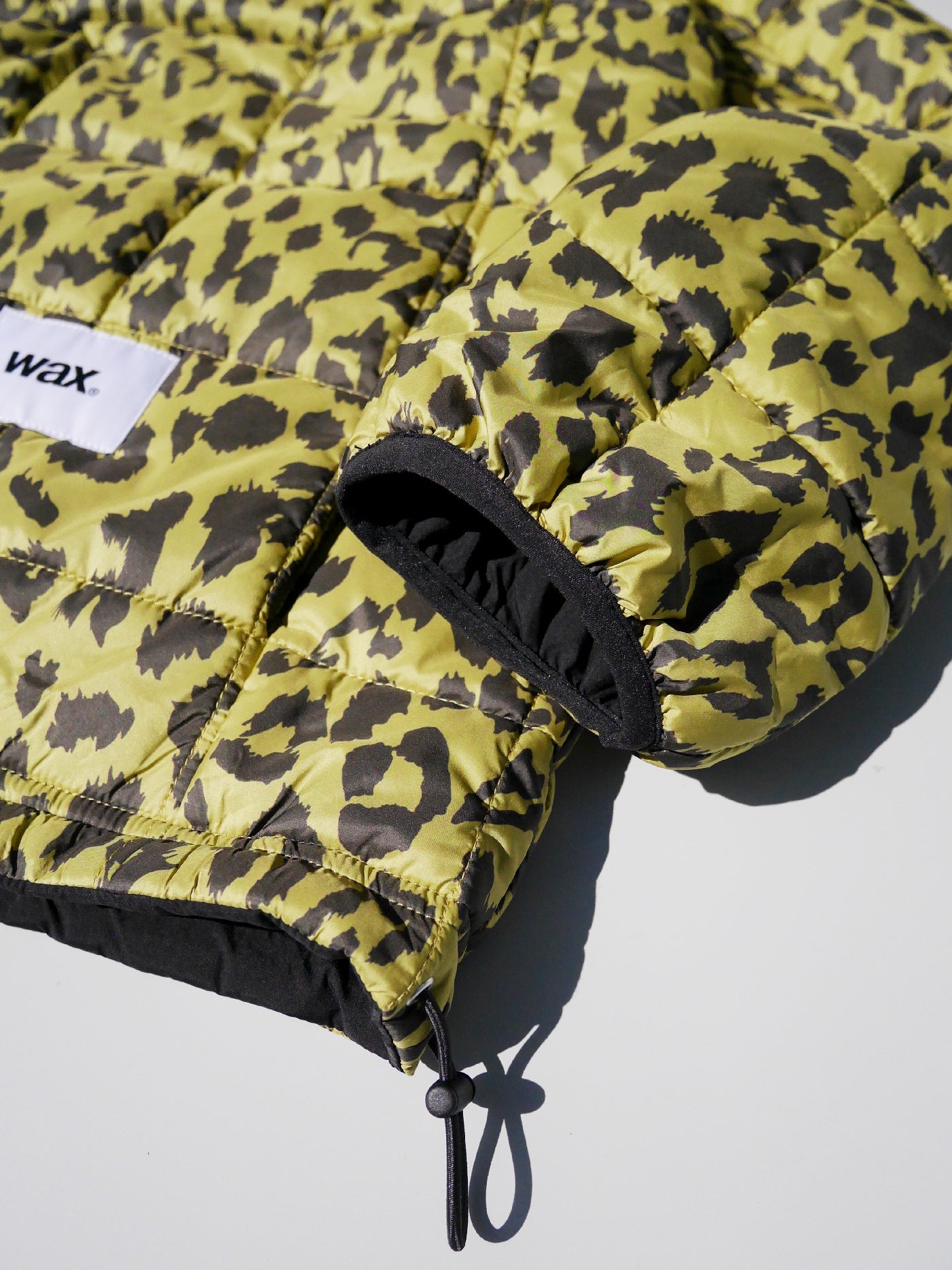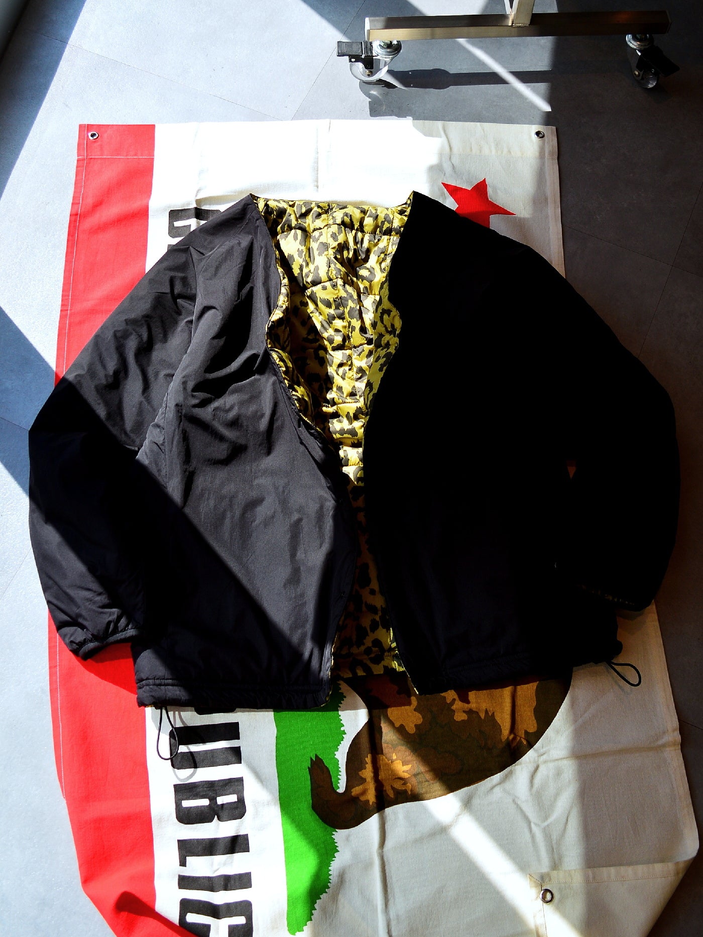 detail : マットな質感のナイロン面と、シャリ感のあるレオパード柄のブロックキルトポリエステル面で使えるリバーシブル中綿ノーカラージャケット、Reversible Nylon Cardigan。